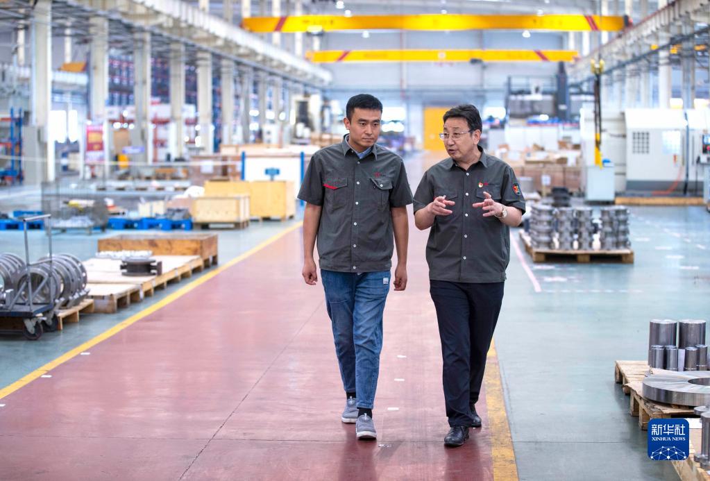 在位于寧夏吳忠市的吳忠儀表有限責任公司自動化產業(yè)園數(shù)字化裝配車間內,馬玉山(右)與技術人員交流(9月12日攝)。 新華社記者 楊植森 攝
