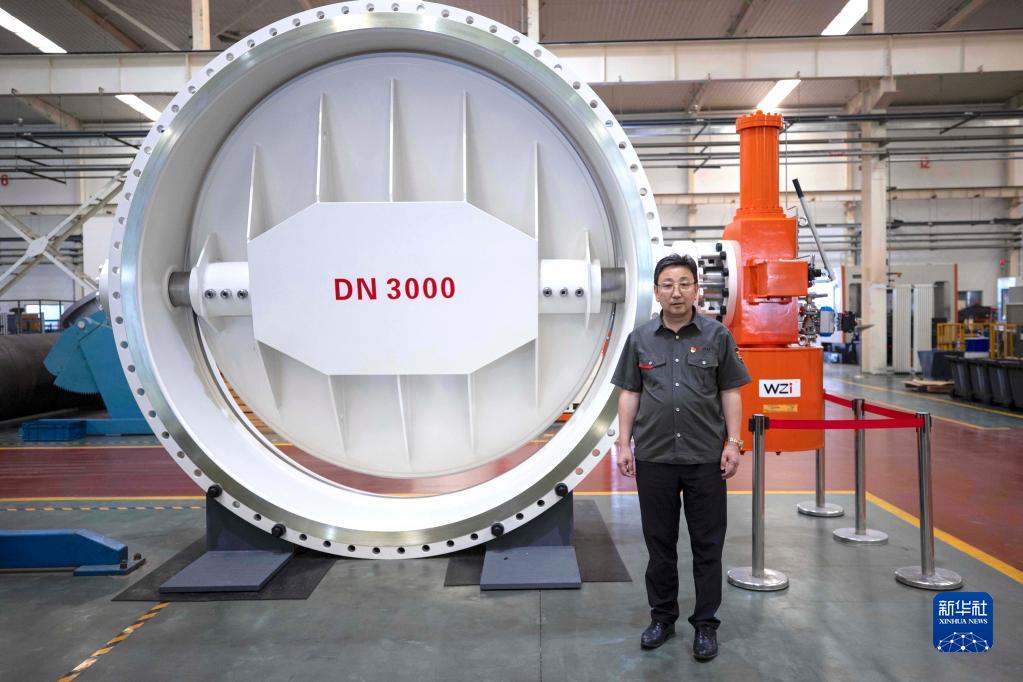 馬玉山在位于寧夏吳忠市的吳忠儀表有限責任公司自動化產業(yè)園數(shù)字化裝配車間中,左側為該公司生產的DN3000三偏心蝶閥(9月12日攝)。 新華社記者 楊植森 攝
