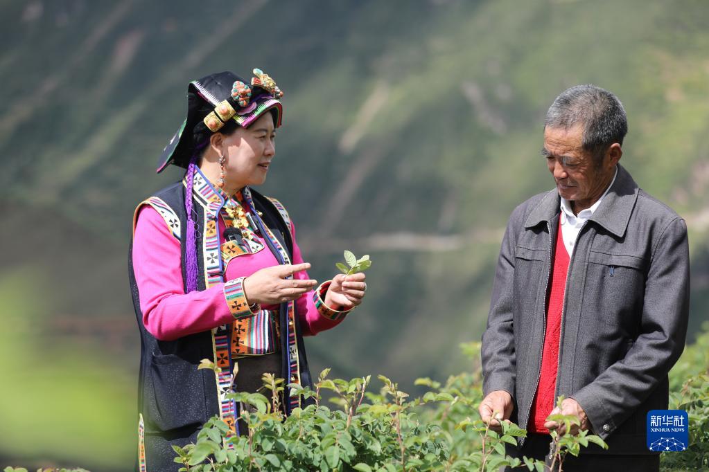 9月25日,陳望慧在四川阿壩州小金縣新橋鄉(xiāng)共和村與村民喻福良探討種植經(jīng)驗(yàn)。新華社記者 劉瓊 攝
