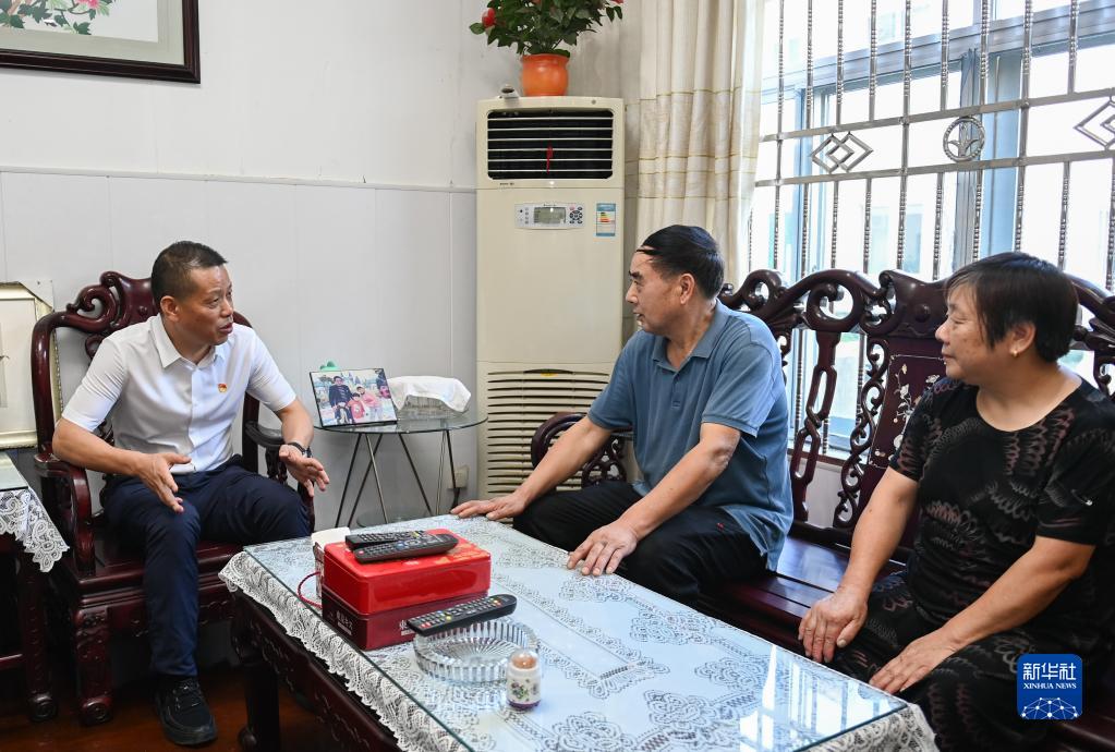 在浙江省寧波市奉化區(qū)蕭王廟街道滕頭村,傅平均(左)入戶走訪村民,聽取意見和建議(9月16日攝)。新華社記者 黃宗治 攝
