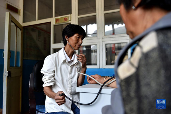 劉桂珍在山西省代縣段家灣村衛(wèi)生所,為一名村民測量血壓(資料照片)。新華社記者 詹彥 攝