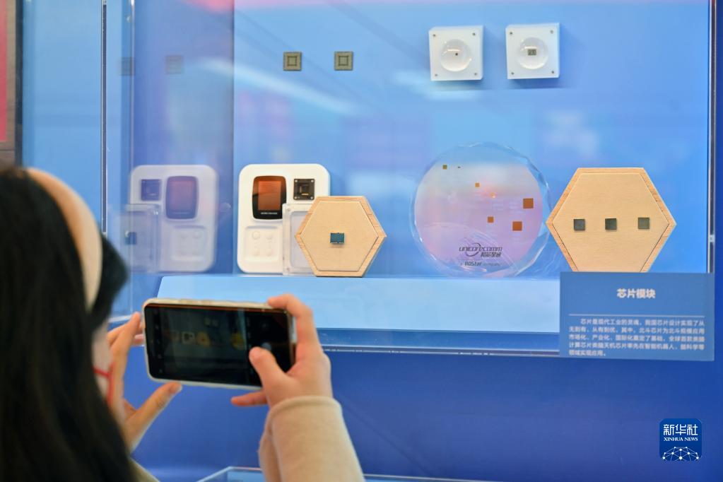 10月8日,一名觀眾拍攝名為“方寸之間”的陳列墻上的芯片模塊展示。新華社記者 李鑫 攝