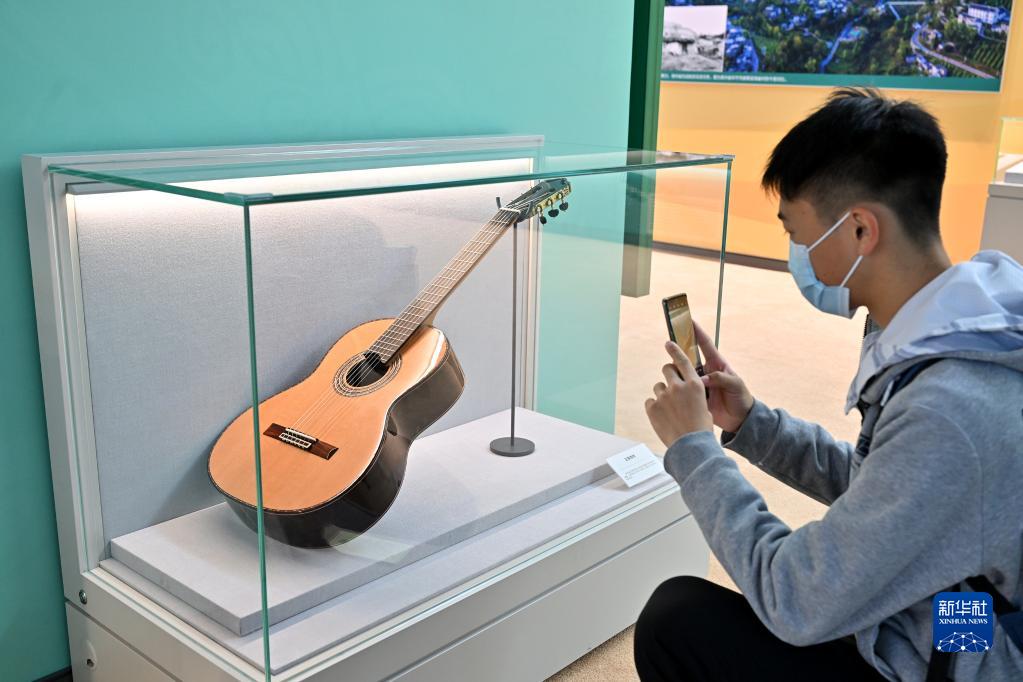 10月8日,一名觀眾在貴州展區(qū)拍攝正安吉他。貴州省正安縣目前已成為全球最大吉他生產(chǎn)基地,已帶動近15000人在家門口就業(yè)、6000余人穩(wěn)定脫貧。新華社記者 李鑫 攝