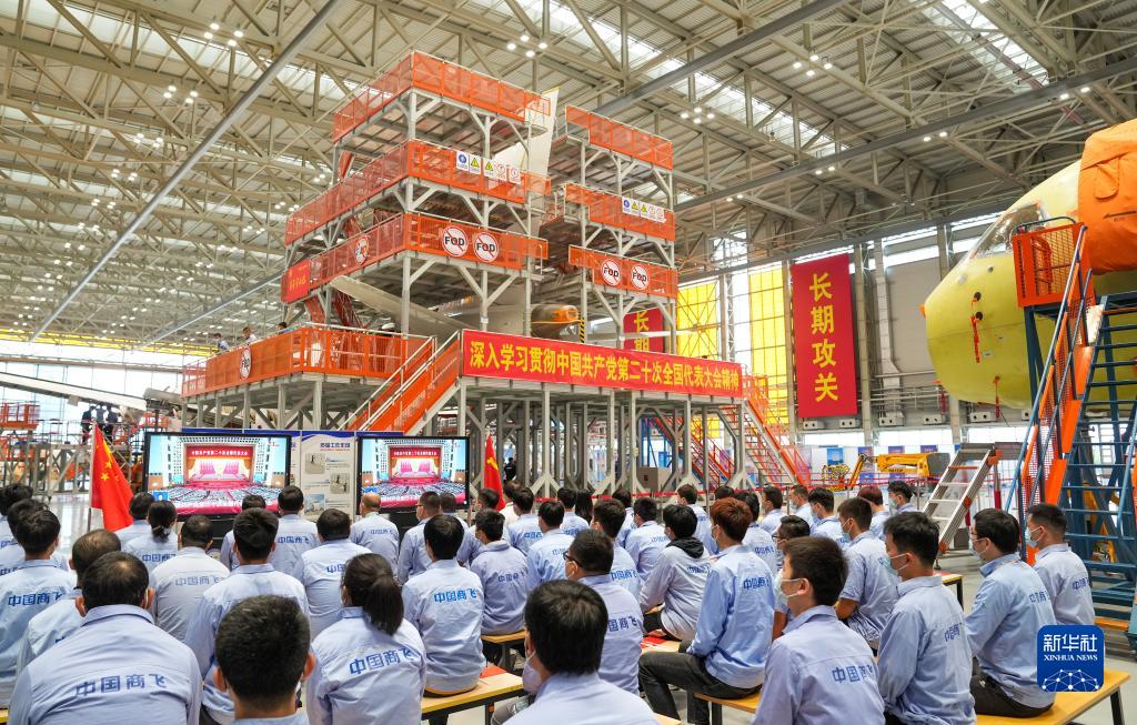 10月16日,在中國商飛上海飛機(jī)制造有限公司總裝車間,員工們?cè)谑湛粗袊伯a(chǎn)黨第二十次全國代表大會(huì)開幕會(huì)。新華社記者 丁汀 攝
