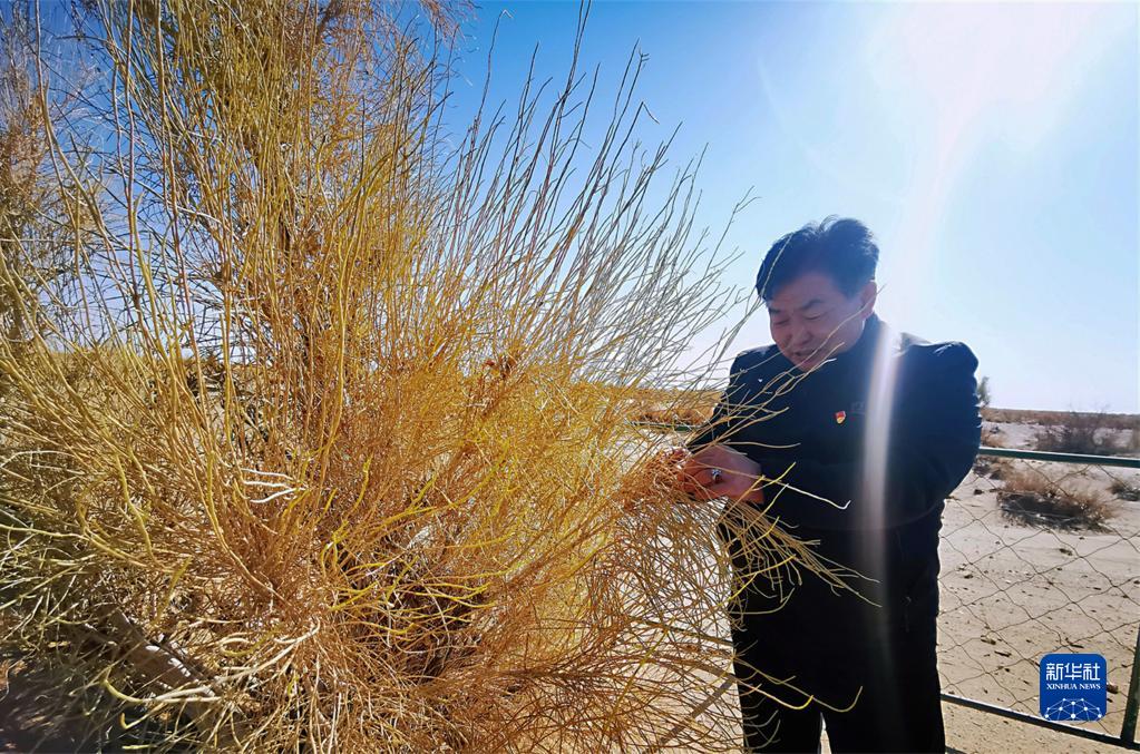 11月4日,內(nèi)蒙古巴彥淖爾市烏拉特后旗巴音查干嘎查黨支部書記寶玉查看梭梭長勢。新華社記者 李云平 攝