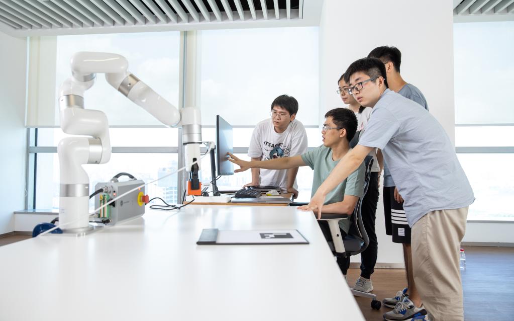 圖為吳翼(左三)及其團(tuán)隊(duì)正在開展可泛化的機(jī)械臂控制相關(guān)科研工作。