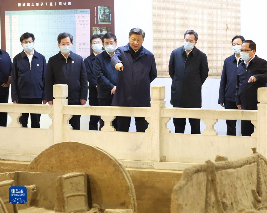 10月26日至28日,中共中央總書記、國家主席、中央軍委主席習(xí)近平在陜西省延安市、河南省安陽市考察。這是28日下午,習(xí)近平在安陽市殷墟遺址考察。 新華社記者 鞠鵬 攝