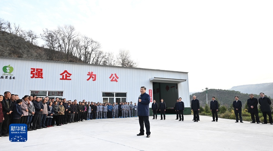 車間外,老鄉(xiāng)們聚集在一起,高聲向總書記問好。習(xí)近平同老鄉(xiāng)們拉起家常,回憶當年他在陜北的知青歲月。習(xí)近平對老鄉(xiāng)們說,我在陜北生活了7年,當年看到老鄉(xiāng)們生活很艱苦,心里就想著怎么樣讓大家生活好起來。這次來延安,看到一派碩果累累的豐收景象,交通條件大為改善,發(fā)生了翻天覆地的變化。過去陜北老鄉(xiāng)們修梯田、種莊稼,面朝黃土背朝天,掄起老鋤頭干活,廣種薄收,十分辛苦,如今山坡上退耕還林種上了蘋果,老鄉(xiāng)們有工作、有穩(wěn)定收入,孩子有好的教育,老人都有醫(yī)保,生活越來越好。從陜北的變化就可以看到中國的變化。習(xí)近平指出,現(xiàn)在,“兩個一百年”奮斗目標的第一個百年目標已經(jīng)實現(xiàn),絕對貧困問題解決了,老鄉(xiāng)們過上了好日子,但還要繼續(xù)努力往前走,讓生活越來越美好。陜北的氣候、光照、緯度、海拔等非常適宜發(fā)展蘋果種植,加上滴灌技術(shù)、矮化種植技術(shù)、選果生產(chǎn)線等不斷發(fā)展,就地賣出,銷路不愁,大力發(fā)展蘋果種植業(yè)可謂天時地利人和,這是最好的、最合適的產(chǎn)業(yè),大有前途。習(xí)近平強調(diào),中國共產(chǎn)黨是人民的黨,是為人民服務(wù)的黨,共產(chǎn)黨當家就是要為老百姓辦事,把老百姓的事情辦好。空談?wù)`國,實干興邦。要認真學(xué)習(xí)貫徹黨的二十大精神,全面推進鄉(xiāng)村振興,把富民政策一項一項落實好,加快推進農(nóng)業(yè)農(nóng)村現(xiàn)代化,讓老鄉(xiāng)們生活越來越紅火。老鄉(xiāng)們爆發(fā)出雷鳴般的掌聲。