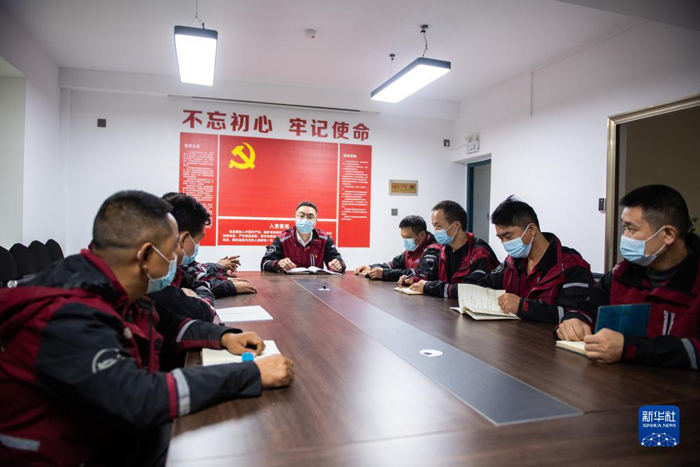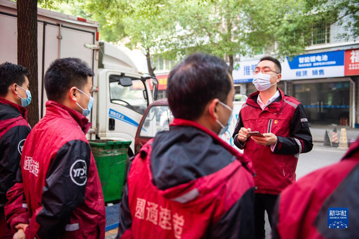 11月8日,在圓通速遞湖南省長(zhǎng)沙市高橋分公司,馬石光(右一)和同事舉行晨會(huì)。新華社記者 陳思汗 攝