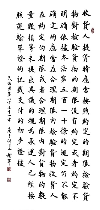 民法典第八百三十一條 收貨人提貨時應(yīng)當(dāng)按照約定的期限檢驗貨物。對檢驗貨物的期限沒有約定或者約定不明確,依據(jù)本法第五百一十條的規(guī)定仍不能確定的,應(yīng)當(dāng)在合理期限內(nèi)檢驗貨物。收貨人在約定的期限或者合理期限內(nèi)對貨物的數(shù)量、毀損等未提出異議的,視為承運(yùn)人已經(jīng)按照運(yùn)輸單證的記載交付的初步證據(jù)。