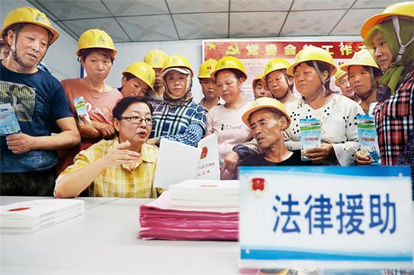 2020年8月26日,河北省唐山市豐潤區(qū)司法局組織律師走進(jìn)社區(qū)、工地,為群眾提供免費法律援助。人民圖片 朱大勇/攝