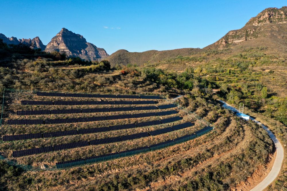 山西省左權(quán)縣麻田村的村級光伏電站。(無人機照片,新華社記者 曹陽2020年10月16日攝)