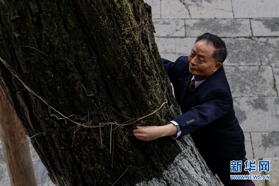 1月27日,67歲的“樹醫(yī)生”張本光在查看遵義會(huì)議會(huì)址前槐樹的生長(zhǎng)狀況。新華社記者 歐東衢 攝