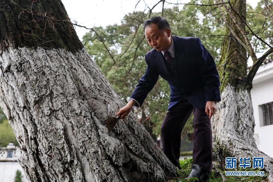 “這些年來,大大小小的病蟲害它都遇到過?!睆埍竟庹f,“就像一個(gè)政黨,發(fā)展道路上也會(huì)碰到各種問題,關(guān)鍵是要向惡疾亮劍,對(duì)病灶開刀?!彼弥簟㈢P子等工具,一面為大槐樹清理青苔、修剪枝條,一面對(duì)記者說。他會(huì)定期來會(huì)址,義務(wù)為大槐樹做“體檢”,以預(yù)防病蟲害。