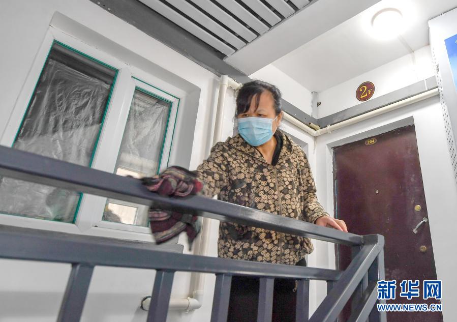2020年4月22日,在四平市鐵東區(qū)東星社區(qū)東興小區(qū),居民高靜打掃改造完畢的樓道。新華社記者 張楠 攝