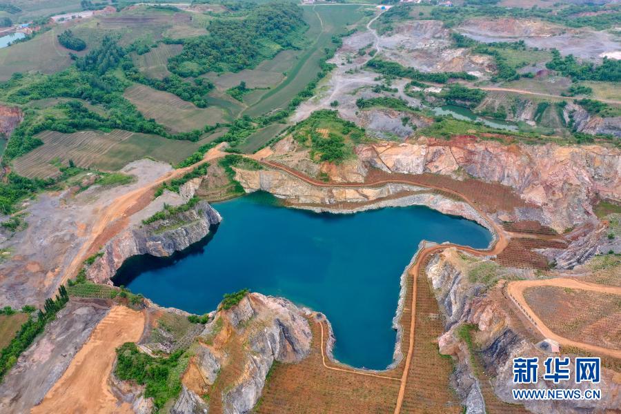 在四平市梨樹縣孟家?guī)X鎮(zhèn)馬家油坊村,實(shí)施礦山復(fù)綠生態(tài)修復(fù)工程后形成的“小天池”景區(qū)(2020年6月22日攝,無人機(jī)照片)。新華社記者 張楠 攝