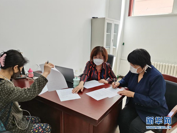 天津市和平區(qū)信訪事項人民調(diào)解委員會主任王玉珍(中)對雙方當(dāng)事人進(jìn)行調(diào)解(2020年5月13日手機(jī)拍攝)。新華社發(fā)
