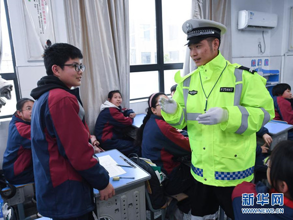 3月16日,湖州市交警支隊(duì)東林中隊(duì)的輔警給東林中學(xué)的學(xué)生上交通安全課。新華社記者 徐昱 攝
