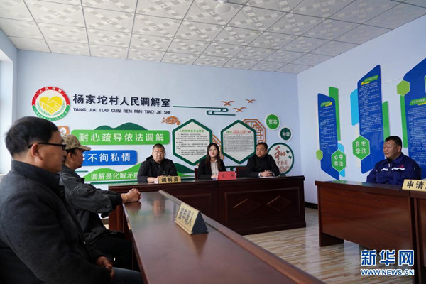 4月18日,律師甄彩麗(中)在河北唐山灤州市茨榆坨鎮(zhèn)楊家坨村人民調(diào)解室內(nèi)為群眾解答法律問題。
