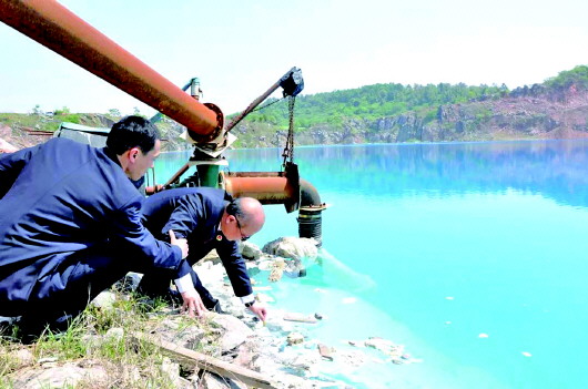 圖為蕪湖市弋江區(qū)檢察院檢察官現(xiàn)場勘測污染水體。通訊員 朱玉勝 攝
