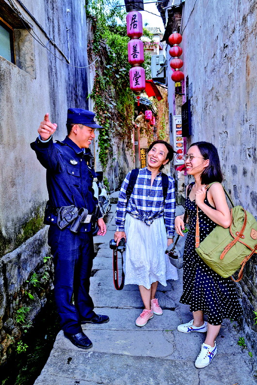 圖為黃山市宏村派出所民警在景區(qū)幫助游客。通訊員 程大亮 攝