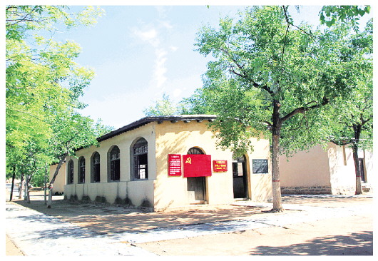 走進(jìn)會(huì)場,只見正面掛著一塊絳紫色的幕布,幕布上懸掛兩面繡有“中國共產(chǎn)黨”字樣的黨旗,黨旗上方是毛澤東和朱德的兩幅畫像,會(huì)場兩側(cè)的白墻上懸掛著四面黨旗。
