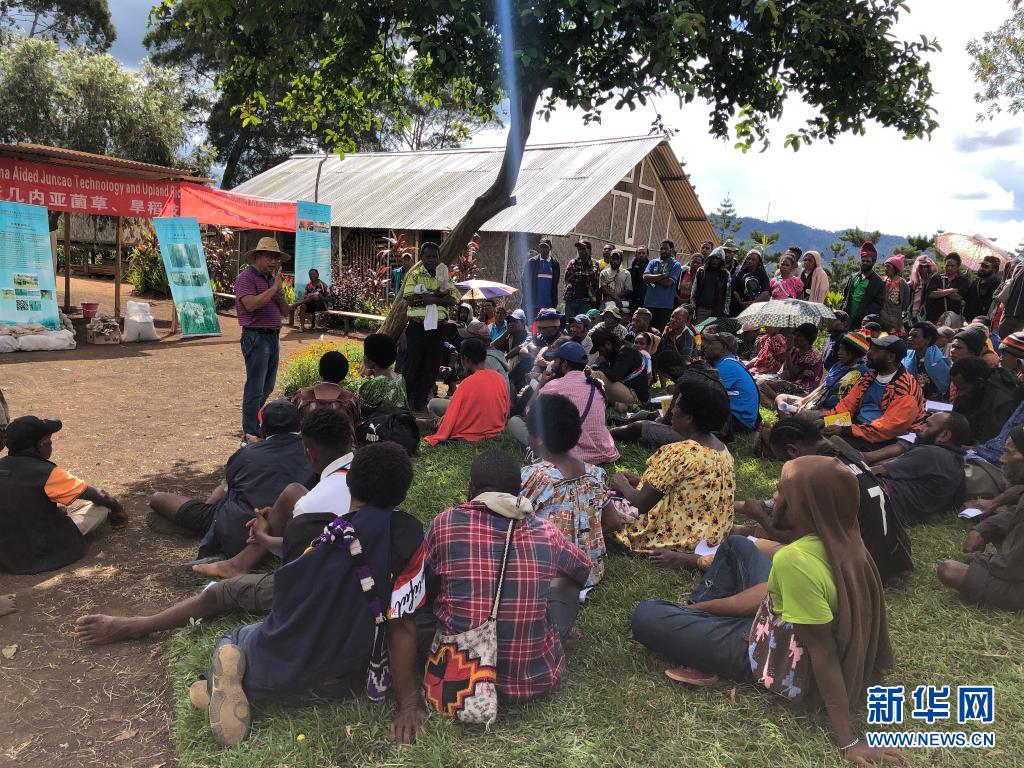 2020年12月15日,林應(yīng)興(戴草帽者)在巴布亞新幾內(nèi)亞東高地省中國援助巴新菌草和旱稻技術(shù)項目第9期培訓(xùn)班上授課。新華社發(fā)