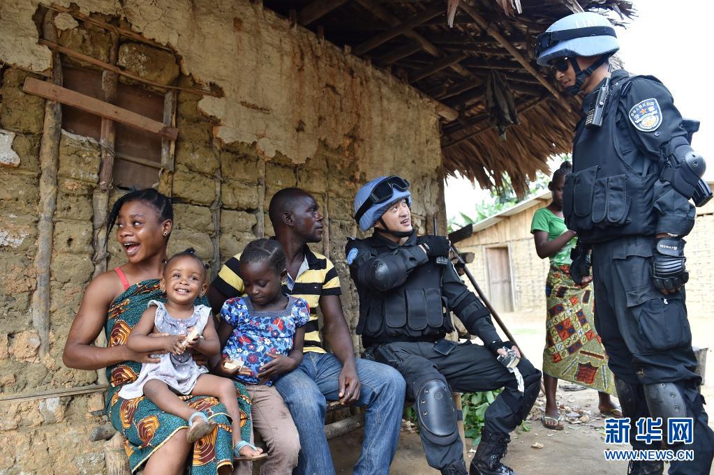 中國維和警察防暴隊隊員在利比里亞格林維爾的一座村莊詢問當(dāng)?shù)刂伟驳惹闆r(2015年11月3日攝)。新華社記者 孫瑞博 攝