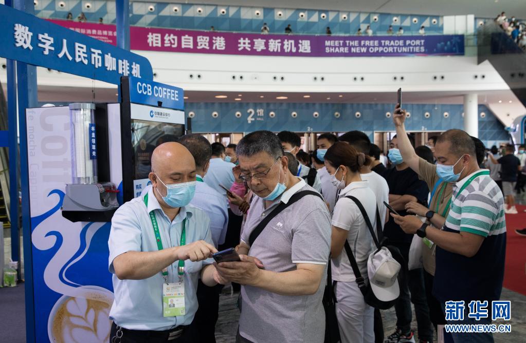 在??谂e行的首屆中國國際消費品博覽會上,參觀者體驗數(shù)字人民幣咖啡機(jī)(2021年5月10日攝)。新華社記者 金立旺 攝