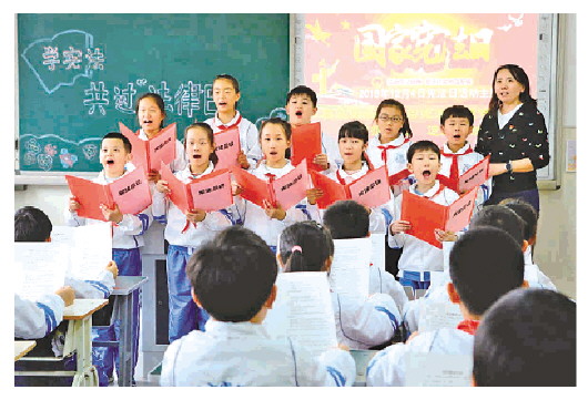 2018年12月3日,天津市實驗小學的孩子們在老師的帶領(lǐng)下誦讀學習憲法。 新華社記者 劉東岳 攝