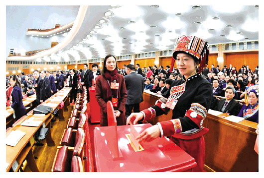 2018年3月11日,十三屆全國人大一次會議在北京人民大會堂舉行第三次全體會議。這是代表投票表決憲法修正案草案。 新華社記者 饒愛民 攝