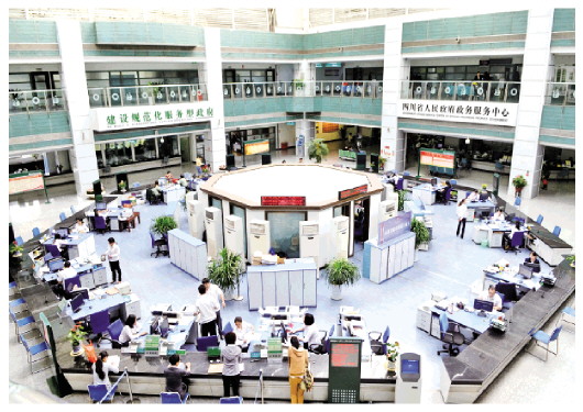 2013年,國務(wù)院決定先行取消和下放91項(xiàng)行政審批事項(xiàng),并要求各部門加大減少和下放行政審批事項(xiàng)工作力度,簡政放權(quán)、放管結(jié)合、優(yōu)化服務(wù),簡稱“放管服”改革。圖為四川省人民政府政務(wù)服務(wù)大廳。 法治日報全媒體記者 楊晉峰 攝