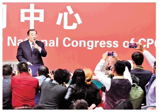 2017年10月19日,中國共產(chǎn)黨第十九次全國代表大會舉行記者招待會,請時任中央紀(jì)委副書記、監(jiān)察部部長、國家預(yù)防腐敗局局長楊曉渡等介紹加強(qiáng)黨建工作和全面從嚴(yán)治黨,堅定不移推進(jìn)依規(guī)治黨,建設(shè)完善黨內(nèi)法規(guī)體系的情況。李鑫 攝