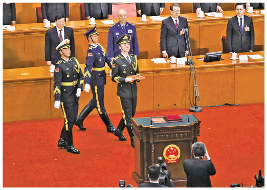 2018年3月17日,十三屆全國人大一次會議憲法宣誓儀式在北京人民大會堂舉行。主席臺上,3名禮兵邁著正步護(hù)送《中華人民共和國憲法》入場。 居楊 攝