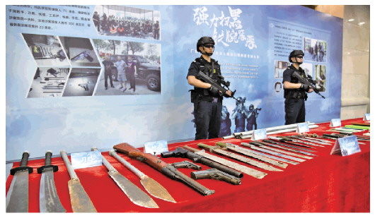 2018年1月,中共中央、國務(wù)院發(fā)布《關(guān)于開展掃黑除惡專項(xiàng)斗爭的通知》。三年來,全國共打掉涉黑組織3644個,黑惡犯罪得到根本遏制。圖為廣東警方查扣的涉黑涉惡團(tuán)伙的涉案物品。 鄧華 攝