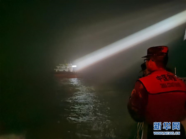海警執(zhí)法員深夜追緝涉嫌非法運砂船舶(2月28日攝)。 新華社發(fā)