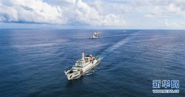 海警艦艇編隊在轄區(qū)海域巡邏(7月7日攝,無人機照片)。 新華社發(fā)