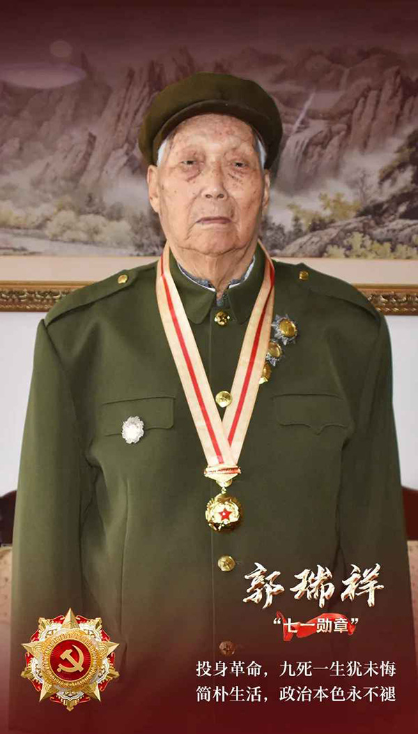 2021年6月29日,101歲的郭瑞祥身著綠軍裝,坐在輪椅上接受了習近平總書記親自授予的“七一勛章”。