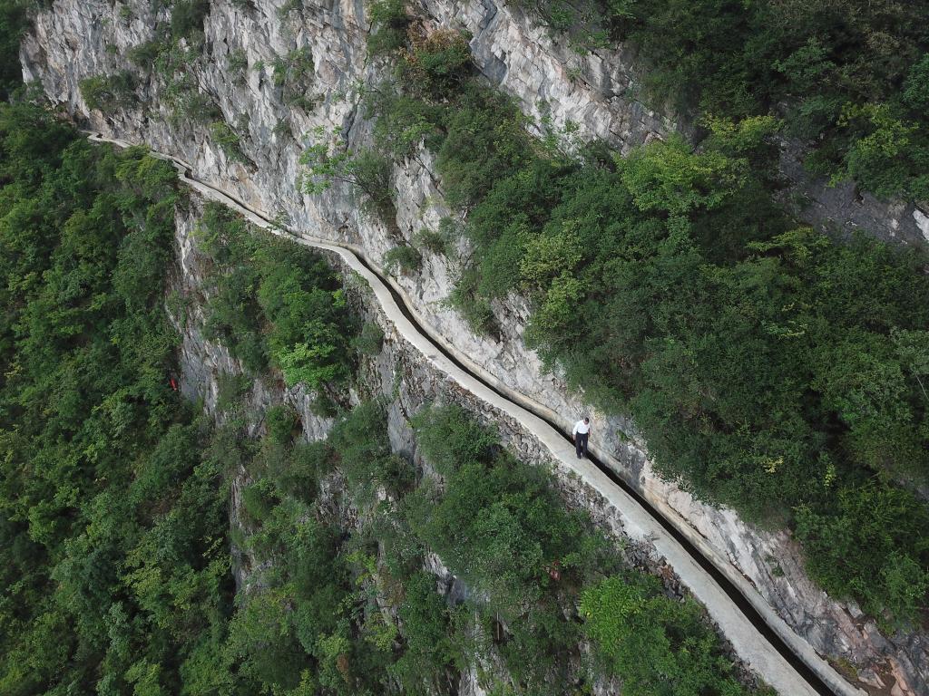 黃大發(fā)沿著修建在絕壁上的“大發(fā)渠”巡查(2018年8月11日無人機拍攝)。新華社記者劉續(xù)攝