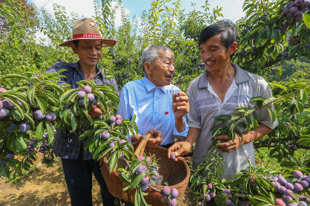 黃大發(fā)(中)和果農們研究水果種植技術(2018年8月12日攝)。新華社記者劉續(xù)攝
