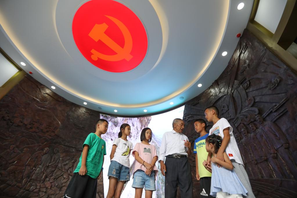 在“大發(fā)渠黨性教育陳列館”,黃大發(fā)向前來參觀的孩子們講述當年的故事(2018年8月11日攝)。新華社記者劉續(xù)攝