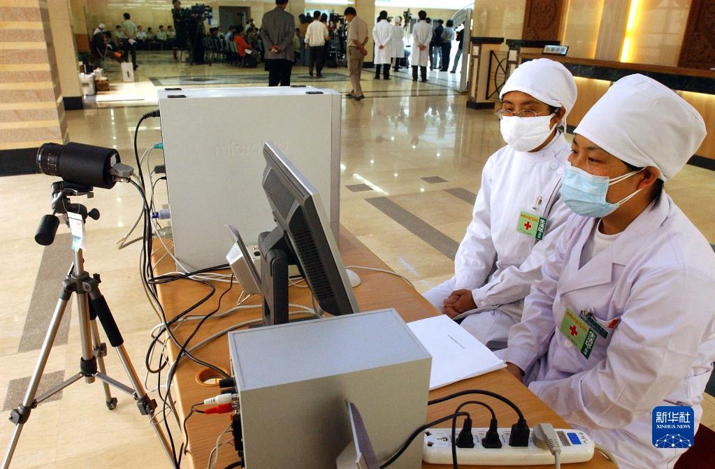 2003年5月7日,北京小湯山“非典”定點(diǎn)醫(yī)院的兩名工作人員在醫(yī)院進(jìn)出口通過紅外熱成像系統(tǒng)對進(jìn)出人員進(jìn)行體溫監(jiān)測。新華社記者 王呈選 攝