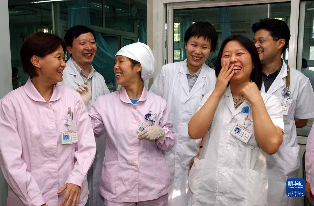 2003年6月24日,北京大學(xué)第一醫(yī)院呼吸科重癥監(jiān)護(hù)病房的醫(yī)護(hù)人員聽到世衛(wèi)組織對北京“雙解除”的消息后,露出勝利的笑容。當(dāng)日,世界衛(wèi)生組織取消對北京地區(qū)的旅行警告,同時(shí)將北京從有疫情傳播地區(qū)的名單上去除。新華社記者 王呈選 攝