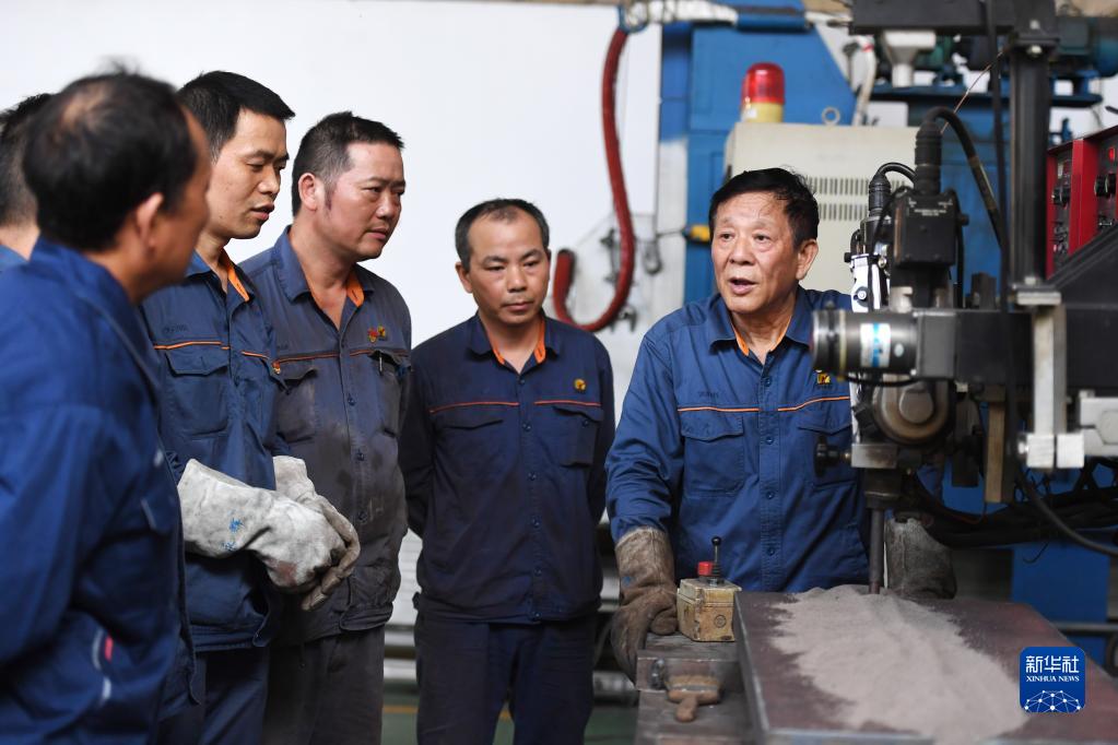 6月17日,艾愛國(左一)在湖南湘潭湘鋼高級(jí)技工學(xué)校焊接實(shí)習(xí)基地檢查學(xué)生的焊接作業(yè)。新華社記者 薛宇舸 攝