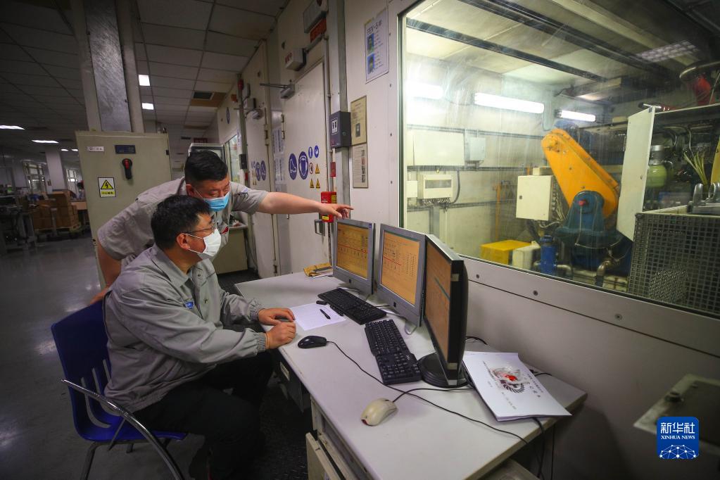 一汽解放大連柴油機(jī)有限公司的高級(jí)技師鹿新弟(前)在車間檢查柴油機(jī)的運(yùn)行狀況(2020年5月7日攝)。新華社記者 龍雷 攝