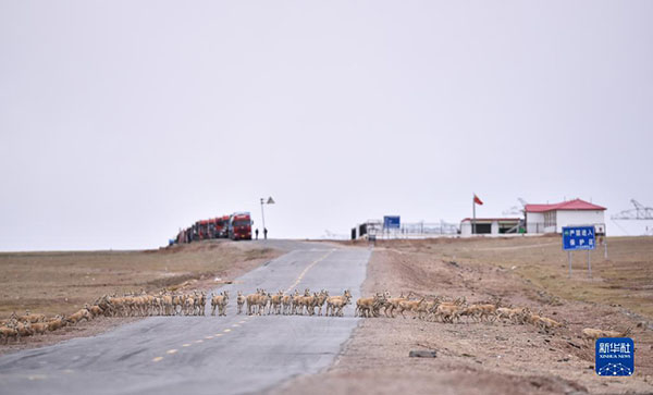 在青海可可西里,一群雌性待產(chǎn)藏羚羊正在通過(guò)青藏公路(2016年6月7日攝)。新華社記者 吳剛 攝