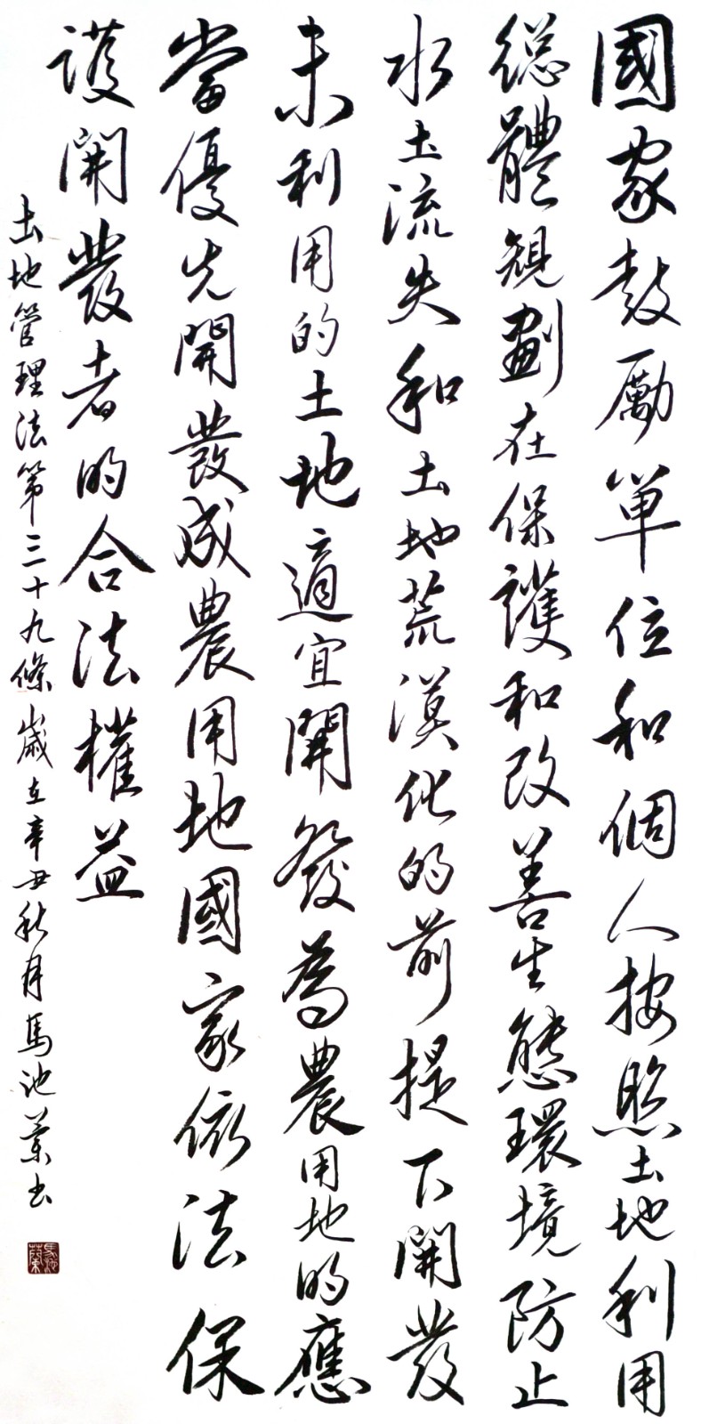 繼1600余位書法家參與書寫《中華人民共和國民法典》全部1260條法條之后,法治日報社聯(lián)合自然資源部法規(guī)司、自然資源部書畫研究會和北京昌平書法家協(xié)會,將筆端對準土地管理“一法一條例”,即《中華人民共和國土地管理法》和《中華人民共和國土地管理法實施條例》。