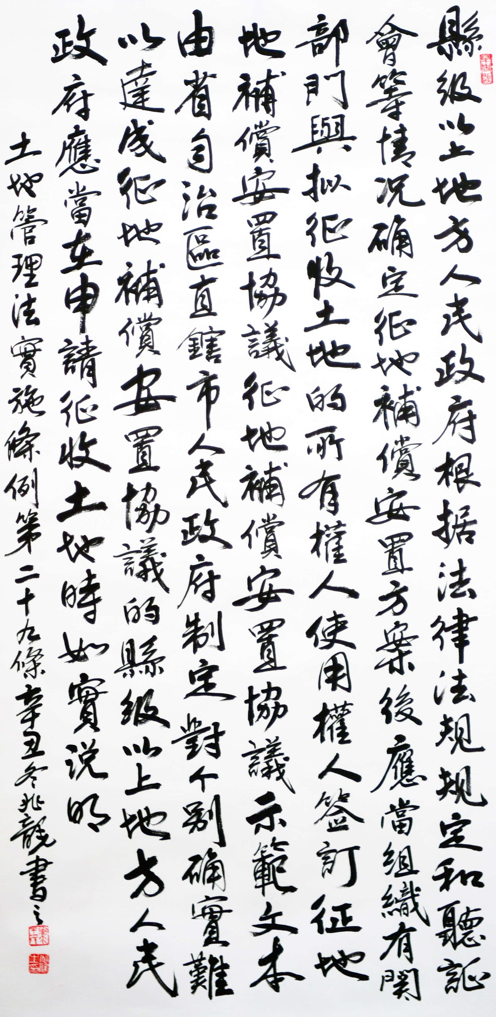 繼1600余位書法家參與書寫《中華人民共和國民法典》全部1260條法條之后,法治日報社聯(lián)合自然資源部法規(guī)司、自然資源部書畫研究會和北京昌平書法家協(xié)會,將筆端對準(zhǔn)土地管理“一法一條例”,即《中華人民共和國土地管理法》和《中華人民共和國土地管理法實施條例》。
