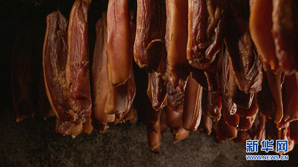 在炕房現(xiàn)場,分上中下三層懸掛的臘肉,可以充分吸收青杠木燃燒過程中的香味。新華網(wǎng) 翟亦平 攝