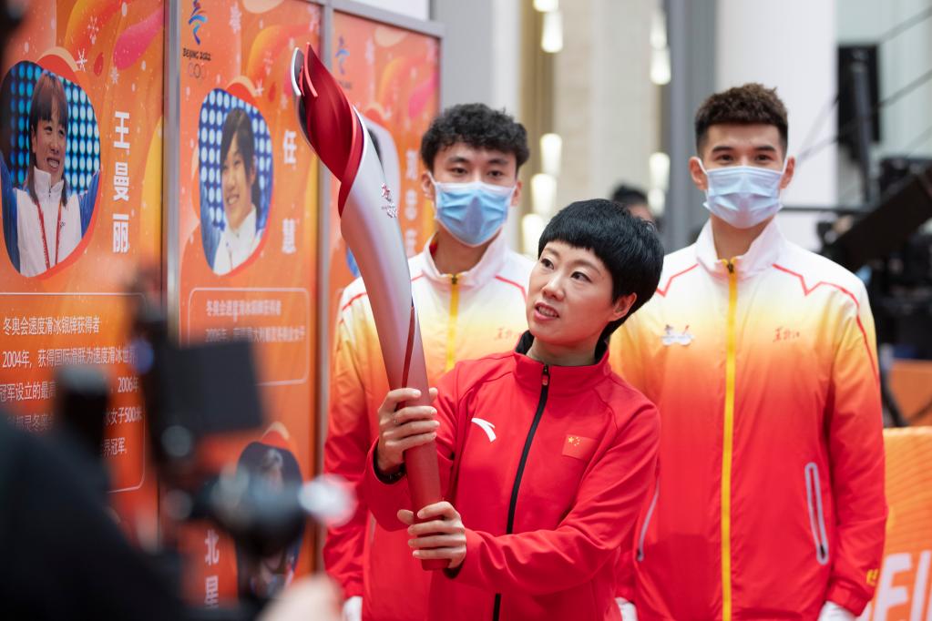 1月5日,冬奧會短道速滑冠軍張會(中)在北京2022年冬奧會火炬展示活動現(xiàn)場手持火炬進行展示。新華社記者 張濤 攝